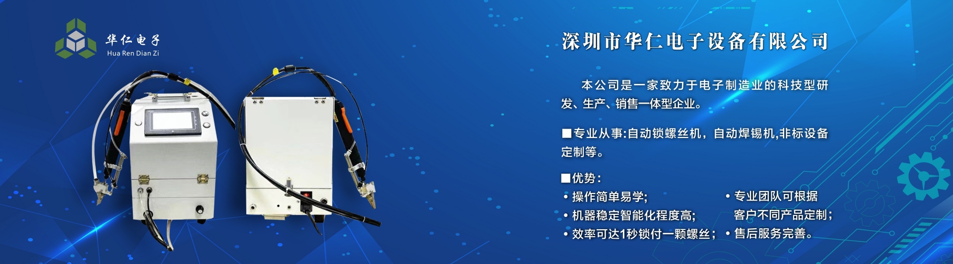 深圳市華仁電子設(shè)備有限公司是一家致力于電子制造業(yè)周邊設(shè)備的科技型研發(fā)、生產(chǎn)、銷(xiāo)售一體的企業(yè),專(zhuān)業(yè)從事:自動(dòng)鎖螺絲機(jī);自動(dòng)焊錫機(jī);非標(biāo)設(shè)備定制機(jī)等,公司長(zhǎng)期以來(lái)在行業(yè)中積累了豐富的經(jīng)驗(yàn),擁有專(zhuān)業(yè)的研發(fā)、技術(shù)、銷(xiāo)售支持工程團(tuán)隊(duì)、各高級(jí)技術(shù)人才為客戶(hù)提供優(yōu)質(zhì)產(chǎn)品和服務(wù),同時(shí)不斷吸取國(guó)內(nèi)外先進(jìn)技術(shù),更準(zhǔn)確及時(shí)地為客戶(hù)提供優(yōu)質(zhì),性?xún)r(jià)比高的產(chǎn)品、公司以專(zhuān)業(yè)的售前、售中、售后服務(wù)贏得了客戶(hù)的信賴(lài)和好評(píng),為客戶(hù)提供先進(jìn)自動(dòng)化設(shè)備一體式解決方案、